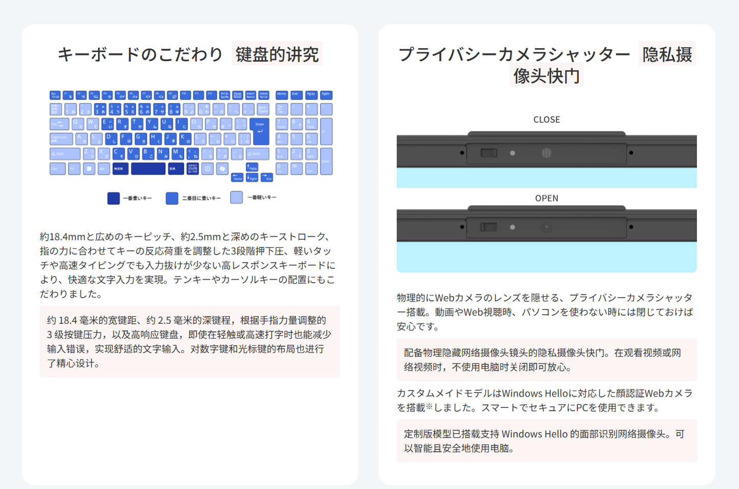 此外,这款笔记本的键盘采用2.5mm长键程设计,针对常用输入区域将键盘划为3部分,分别提供不同的按键触感,可实现舒适的输入体验,网络摄像头支持WindowsHello,还拥有物理开关,保护隐私,还可选配遥控器,让用户像操作电视一样观看Netflix等网络平台。